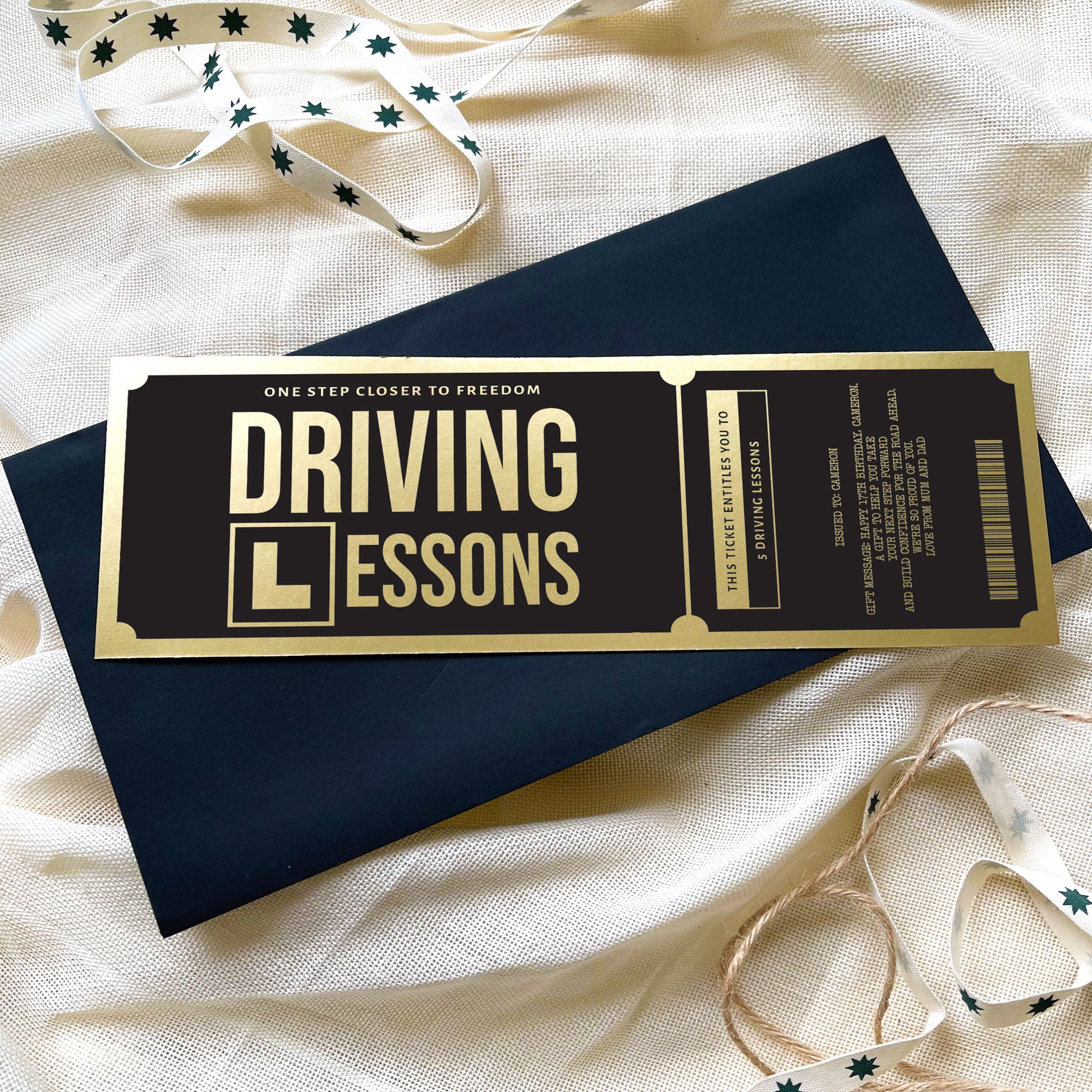 Mark their 17th birthday in style with this driving lesson gold voucher that makes the big milestone feel properly exciting. This stylish driving lesson reveal gift is UV printed on genuine Italian gold or silver paper, giving it a rich, luxury finish that instantly feels special. Finished with a sleek black and gold envelope, it’s the perfect way to turn the gift of learning to drive into a moment they’ll remember — polished, premium, and ready to wow.