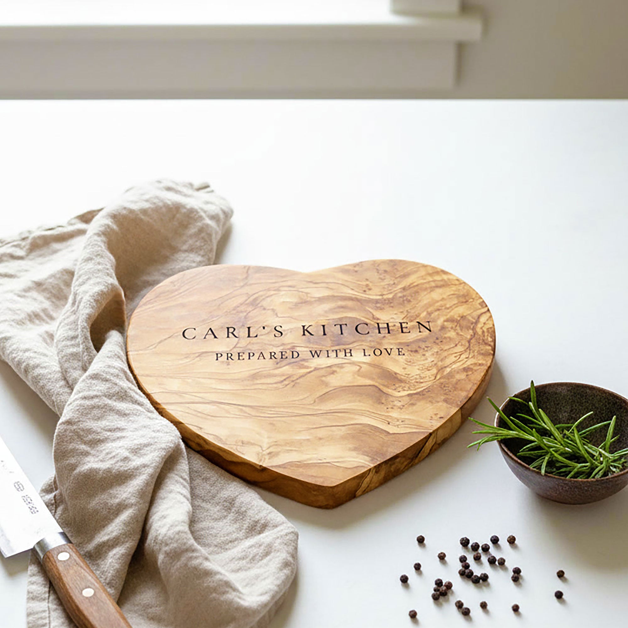 Introducing our personalised olive wood heart cheese board, a culinary masterpiece that combines natural beauty with functionality. Handcrafted from sustainably sourced olive wood, this personalised cheeseboard is not just a serving platter; it's an expression of love for both nature, fine dining.....and cheese!